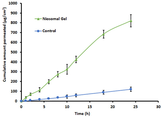 Figure 11. Ex vivo permeation profiles of levosulpiride from niosomal gel and control gel across rat skin. Each value depicts the mean and standard deviation of six different batches.