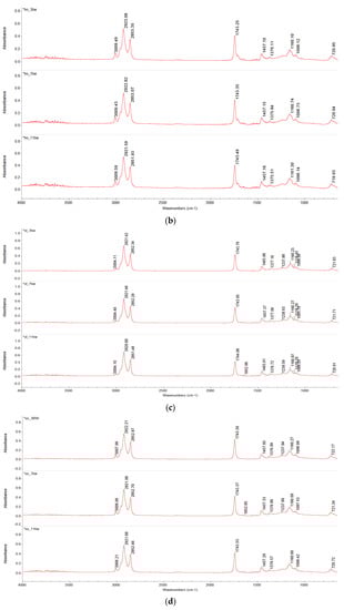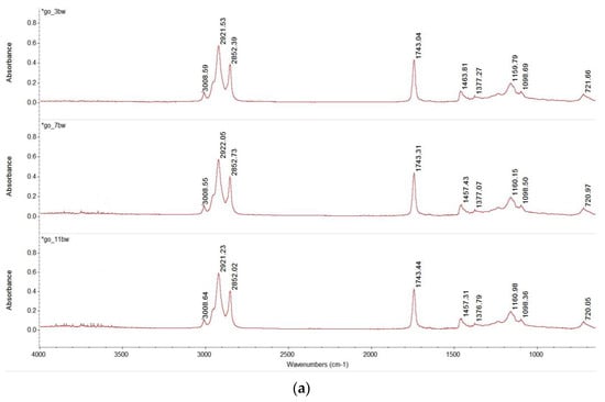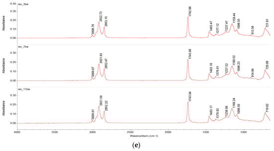 As the spectra in Figure 4 shows, all samples presented similar absorption bands. For each oil type used to obtain the oleogels, the stacked spectra are shown in Figure 4a–e (the overlapped spectra are presented as supplementary material). According to previous studies, the oleogelator (beeswax) has the propensity to structure the solvent (vegetable oil) through a hierarchical molecular self-assembly via non-covalent interactions, resulting in the formation of a three-dimensional network [,]. As the oleogel forms, three main different spectral bands are observed in the FTIR spectra, which are assigned to O–H stretching vibrations, vibrations of the carboxyl group and asymmetric stretching vibrations of CH3 and CH2 groups. The band corresponding to O–H stretching modes is usually found around 3470 cm−1; as this spectral band was not observed for our samples, it can be concluded that no hydrogen bonds were formed in the oleogels with beeswax, which is in agreement with [,]. The small peak around 3009 cm−1 was assigned to the C–H stretching vibration of the cis-double bonds (=CH) of edible oils [], while the pronounced peaks at 2921 cm−1 and 2852 cm−1 were attributed to symmetric and asymmetric stretching vibration of the aliphatic CH2 group. These may be characteristic to waxes, and were reported for various types of oleogels such as soybean oil-carnauba wax oleogel [], shellac wax emulsion oleogels [] and oleogels containing sunflower wax and sunflower oil [].