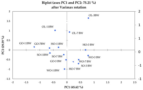 PCA (Figure 5) was performed to better characterize the relationships between the analyzed variables: oil binding capacity (OBC), lipid oxidation (PV) and color. The oleogel samples were divided into different quadrants depending on the correlation coefficient that indicates the strength of the bonds between them. Two main components (PC2/PC1) were extracted from the statistical analysis, which explained the total variance of the data set in a percentage of 75.21% respectively 29.59%. Oleogels with 3% BW correlate with the oxidation index and oil retention. The oleogels with 11% BW correlate with the brightness, and the oil retention capacity in the structure (OBC) correlates with oleogels that have the highest percentage of wax in the structure, respectively 11%. The oleogels were grouped according to the type of oil and the percentage of wax. The oleogels with grape seed oil and hemp seed oil are strongly correlated with the addition of 11% oleogelator. The same trend can be observed in the oleogels obtained with walnut oil and wax percentages of 3% and 7%. The olive oil oleogel with 3% wax (OL_3BW) correlates weakly with the other oleogels. This distribution is explained by the oil retention power in the weak structure, reduced stability and high value peroxide index.