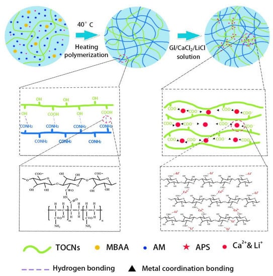 PAM/TOCNs/LiCl/CaCl2/Gl hydrogel mechanism diagram.