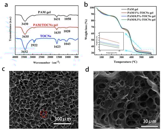 (a) FTIR spectra of PAM/TOCNs hydrogel (red line) and PAM/TOCNs (black line). (b) TGA curves of PAM,PAM/0.3%-TOCNs, PAM/0.5%-TOCNs and PAM/1%-TOCNs hydrogel. (c) SEM images of PAM/1%-TOCNs hydrogel after freeze-drying. (d) Zoomed in SEM image of the red spotty of the PAM/1%-TOCNs hydrogel.