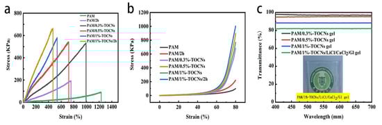 (a) Stress-strain curves. (b) The compressive stress-strain curves. (c) Transparency curve and image of PAM/1%-TOCNs/LiCl/CaCl2/Gl hydrogel film.