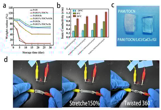 (a) The weight retention rate of hydrogels. (b) Conductivity of hydrogels variation with temperature for different TOCNs contents. (c) Surface morphologies of different hydrogels after 24 h at −20 °C. (d) Stretching and twisting of the hydrogel after 10 months.
