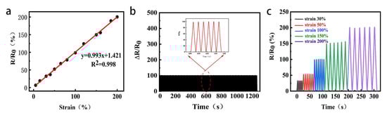 (a) Relative resistance change linear fitting curve of the hydrogel with varying tensile strain. (b) The curve of relative resistance changes of the strain sensor for 220 times under cyclic stretching-releasing testing up to 100% strain. (c) The curve of relative resistance change of the hydrogel with varying tensile strain.