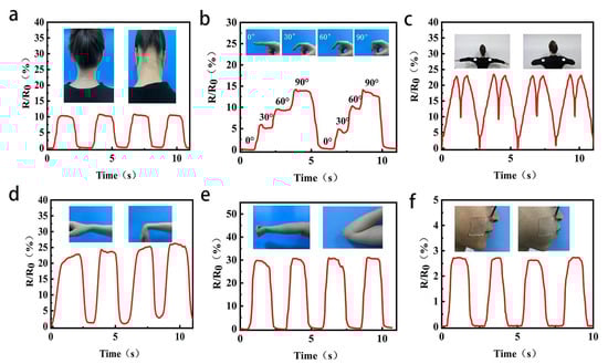 To demonstrate this, we attach the strain sensor of PAM/TOCNs/LiCl/CaCl2/Gl hydrogel directly to the joint or muscle to monitor human movement. These include neck flexion (Figure 7a), finger flexion (Figure 7b), shoulder movement (Figure 7c), wrist flexion (Figure 7d), elbow flexion (Figure 7e), occlusal movement (Figure 7f). These figures show two motion states of human body. It can be seen that the strain sensor of PAM/TOCNs/LiCl/CaCl2/Gl hydrogel can respond to motion quickly and repeatedly, and the response of different movements is different. For example, the change in relative resistance is 15 for a bent finger and 30 for a bent elbow. This is due to the elongation of the hydrogel, which elongates the ion channels, resulting in an increase in the relative resistance change rate of the hydrogel. In addition, for the same motion, the fluctuation amplitude of each motion curve may not be exactly the same. This is because the amplitude of each motion is slightly different, which further illustrates the high sensitivity of the strain sensor of PAM/TOCNs/LiCl/CaCl2/Gl hydrogels. Based on the human motion monitoring demonstration above, hydrogel sensors show great potential and are used as wearable devices for high sensitivity and high reliability monitoring of human activities.