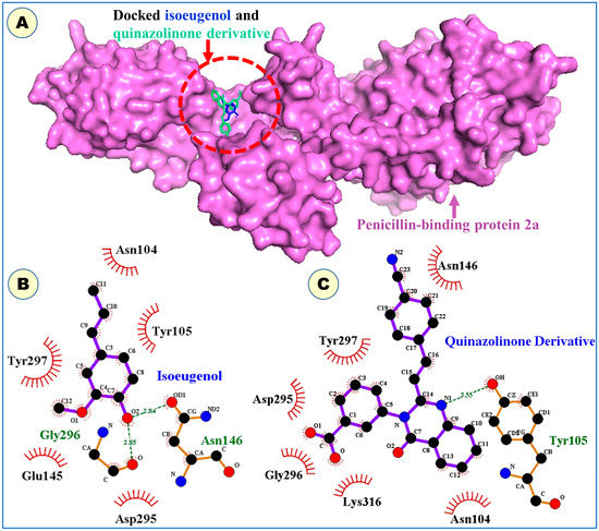 Rapid advancements in computer hardware and software have benefited the drug design and discovery field greatly, paving the way for new drug development at a substantially reduced time and cost. Therefore, molecular docking was implemented to understand the modus of binding interactions of isoeugenol with penicillin-binding protein 2a (PBP2a). Penicillin-binding proteins catalyze the last steps of the biosynthesis of peptidoglycan cell walls. PBP2a subunit mutations can reduce the effectiveness of β-lactam antibiotics, encouraging Staphylococcus aureus to grow without restriction and developing resistance. A heterocyclic antibiotic without a β-lactam ring, (E)-3-(2-(4-cyanostyryl)-4-oxoquinazolin-3(4H)-yl) benzoic acid, interacts non-covalently with the PBP2a allosteric site and suppresses PBP enzymatic activity in the presence of a double mutation in PBP2a (i.e., N146K and E150K) [30]. Therefore, the binding site of the quinazoline derivative was considered for the molecular docking of isoeugenol in this study.