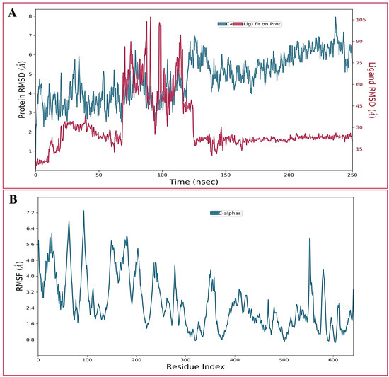 Molecular dynamics (MD) simulation, a prevalent computer-assisted drug design approach, may be used to predict the kinetic and thermodynamic characteristics of biological systems under specified physiological conditions [31,32,33]. Therefore, the best-docked conformation of isoeugenol in complex with penicillin-binding protein 2a was subjected to MD simulation analysis to explore the stability of the ligand-protein complex as well as the principal intermolecular interactions along the simulated trajectory. Various conventional simulation parameters, such as backbone RMSDs for alpha-carbon atoms, were evaluated on the trajectories of the simulated complex. In addition, the root-mean-square fluctuations (RMSFs) of certain amino acid residues and intermolecular interactions were assessed. Figure 2A illustrates the RMSD curve for the simulated complex. As exhibited in the RMSD plot shown on the left side, the simulated system has equilibrated very well and the average fluctuations in the Cα atoms were noted as 4.79 Å. Nonetheless, small fluctuations are to be anticipated within the first 125 ns, after which the simulation trajectory stabilizes. Similarly, the RMSD of the bound ligand, seen on the right side of the plot, fluctuates during the initial 125 ns period before settling into a steady state for the remainder of the simulation trajectory.