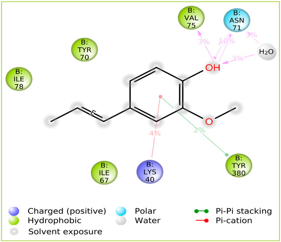 Simulation interaction diagrams presented in Figure 3 during the entire simulation time signify a comprehensive intermolecular interaction profile of isoeugenol with penicillin-binding protein. The modus of the interaction pattern of isoeugenol clearly illustrates that the docking-predicted main contacts were not preserved during the MD simulation. Tyr380 afforded π-π stacking interaction with the aromatic ring of the isoeugenol, while π-cation interaction was observed with Lys40 residue. Other hydrophobic residues include Tyr70, Val75, and Ile78. In addition, Asn71 contributed to the polar interaction with the phenolic hydroxyl group of isoeugenol.
