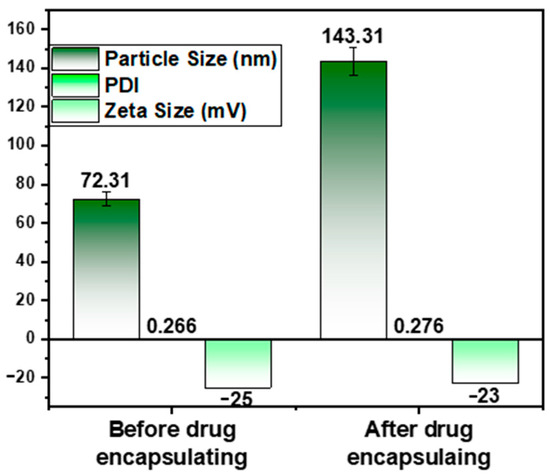 Graphical representation of particle size, PDI, and zeta potential of isoeugenol liposomes before and after encapsulation.