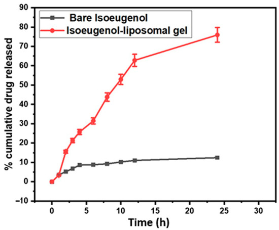The in vitro drug releases to study for both bare isoeugenol and the isoeugenol-liposomal gels were conducted in a pH 6.0 buffer solution for 24 h, as shown in Figure 7. The sample was withdrawn from the release media, further diluted with the media buffer, and then evaluated immediately with the UV technique. From the graph, it is clear that the drug released was observed to be minimal, i.e., 6.85 ± 0.342% (3 h), 11.02 ± 0.551% (12 h) and 12.45 ± 0.622% (24 h). Whereas in the case of isoeugenol-liposomal gel, the drug released was observed to be very high, i.e., 21.32 ± 1.066% (3 h), 62.78 ± 3.13% (12 h) and 75.95 ± 3.79% (24 h). The outcomes of the results showed that the encapsulation of the drug increases the solubility of the drug, and hence in vitro drug release was observed to be more than bare.