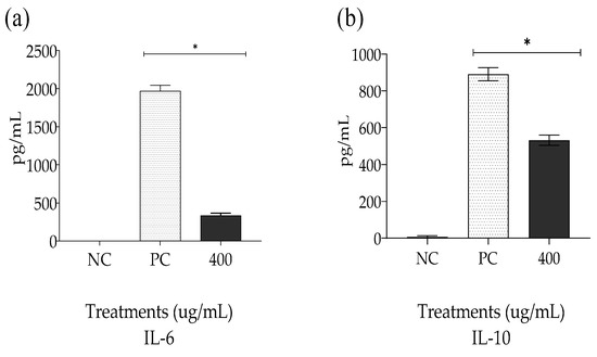 2.5. Quantification of the Levels of Cytokines IL-6 and IL-10 Induced by the Non-Encapsulated Extract (EPPR)