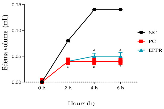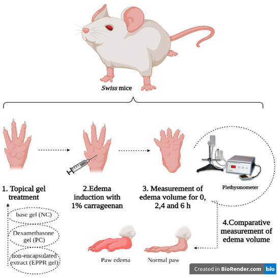 2.7. Determination of the In Vivo Anti-Inflammatory Activity of the Gel Containing the Non-Encapsulated Extract (EPPR gel) on Carrageenan-Induced Paw Edema