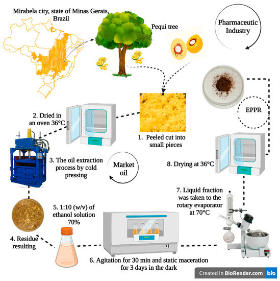 - Cunha, L.M.S.; Pires, R.F.; dos Santos, K.G.; Dantas, S.C. Comparison of yield by different methods of oil extraction from pequi pulp. Res. Soc. Dev. 2020, 9, e342973876. [Google Scholar] [CrossRef]