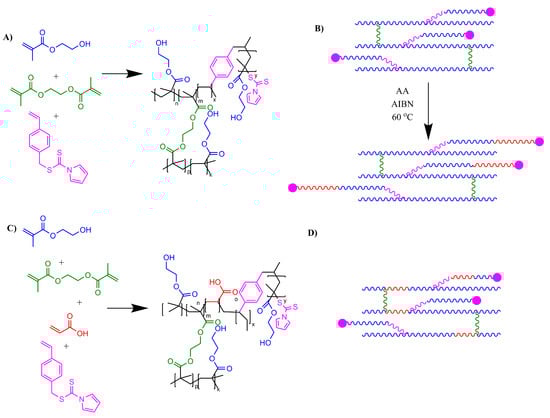(A) Chemical structure of crosslinked hydrogels prepared by thermal initiation of HEMA (blue), EGDMA (green) and RAFT (pink) (PCG 2). (B) Grafting of PAA chains (red) onto HEMA via RAFT chain extension (PCG 2B). (C) Chemical reaction route to prepare hydrogels copolymerized with statistical AA comonomer in initial reaction feed (PCG 3). (D) Overall structure of copolymer AA throughout HEMA gel (PCG 3).