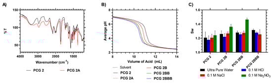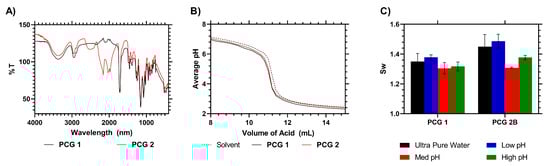 The presence of CTA in PCG 2 was evident from their clear yellow coloration but also was detectable from IR spectroscopy—with new peaks appearing at 2000 and 2170 cm−1. These peaks were due to the presence of the RAFT agent (Figure 2, see ESI for more detailed peak identification). An IEC titration was carried out to determine the ion exchange constant using a buffer to measure the pH 4.5 equivalence point, and neither PCG 1 nor 2 showed a difference compared to the control solvent titration. This indicated an IEC of ≈0 with no significant differences between the samples (N = 3, p < 0.01), confirming that the RAFT functional hydrogel did not exchange ions with the solution. The Sw of the crosslinked hydrogels was also analyzed in ultra-pure water and pH-modified solutions, and a one-way ANOVA comparison of the Sw values of the two materials indicated there was no significant difference between the two materials (p = 0.0667).