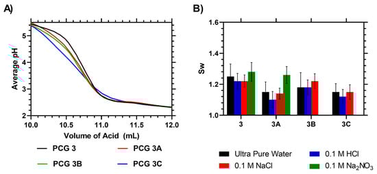 (A): Raw titration data of AA-copolymerized RAFT–HEMA films. (B) Sw of AA-copolymerized RAFT–HEMA films at different pH levels.