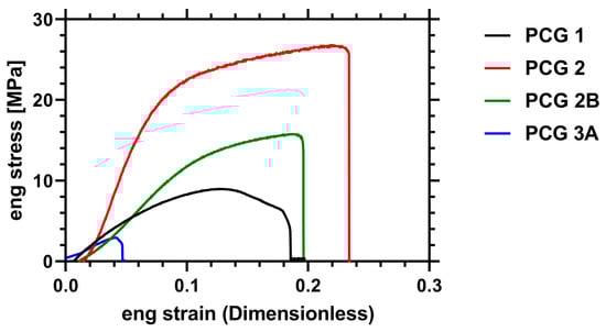 Representative engineering stress/strain curves of PCN 1, 2, 2B and 3A.