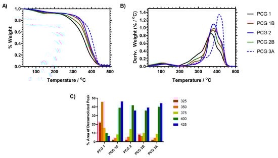 Thermogravimetric analysis at high temperature was carried out to compare the degradation pathways of the gels and further distinguish between the copolymerized statistical AA gels with the chain-extended brushes. It was expected that block-type polymers (such as PCG 2B) would have different thermal degradation behavior to statistical structures (such as PCG 1B and PCG 3B). Thermal degradation is an established method for studying the properties of HEMA hydrogels with peak degradation between 300 and 440 degrees, and polyacrylic acid shows a broad degradation profile from 250 to 450 °C, depending on its composition [,,]. The thermal degradation profile of films prepared is shown in Figure 6 and demonstrates that there was variation in the degradation profile as the HEMA film was modified. The HEMA:AA copolymer showed a broadening of the main mass loss event from 320 to 430 °C (PCG 1) and 340 to 450 °C (PCG 1B). The RAFT-modified HEMA film showed a reduction in lower-temperature degradation of the main derivative mass loss peak (moving it to 350–450 °C, PCG 2) and then functionalization led to an enhancement of the higher-temperature degradation component (400–350 °C, PCG 2B). These data were deconvoluted into five mass loss events (325, 350, 375, 400 and 425 °C, respectively) which showed how the presence of acrylic acid or the RAFT agent increased the high-temperature weight loss component of the materials compared to the raw PHEMA film. Incorporation of the RAFT agent significantly reduced the lower-temperature mass loss component and strengthened the material so that the main decomposition event occurred over the deconvoluted 400 °C region of the decay. Comparatively, incorporation of acrylic acid functionality provided additional stabilization but provided increased stability to the higher 425 °C degradation step in all samples. Therefore, the control PHEMA gel (PCG 1) was the least thermally stable material tested.