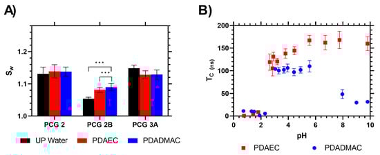 This swelling study was carried out in ultra-pure water with no pH modification. To further confirm the complexation between PAA and these flocculants, a fluorescently loaded polymer probe was synthesized and tested. We showed that this type of PAA can be used as a fluorescent sensor for polymer flocculants, using the emission anisotropic correlation time (τc) to monitor changes in polymer segmental mobility. Using this established method [], fluorescently labelled PAA was tested in the presence of the flocculants, and it was found that, when the pH of the solution was between 2.5 and 6, there was a strong interaction between these polymers, resulting in a slower rotation of the PAA and an increase in the Tc compared to the polymers at low pH. When mixed with PAA, PDAEC and PDADMAC both showed an increase in τc above pH 2.9, correlating with the deprotonation of the acid functional group on the backbone monomers. The correlation time increased sharply and remained constant up to pH 6. Then, for PDADMAC, the correlation time decreased as the solution became more alkaline. Alternatively, the τc of the PDAEC complex remained constant at 160 ns above pH 6. This demonstrated that, at neutral pH, PAA can drive phase separation to remove these potential waterborne polymer pollutants from solution. This confirmed the interaction potential of the PAA linear chains to interact with the polymer flocculants and the swelling mass change observed, shown in Figure 7.