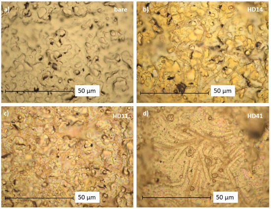 Optical microscope images (1500× magnification) of (a): the unmodiefied goldelectrode and the plasma-polymerized hydrogel coatings (b): HD14, (c): HD11, (d): HD41) deposited on gold, generated through the droplet method.