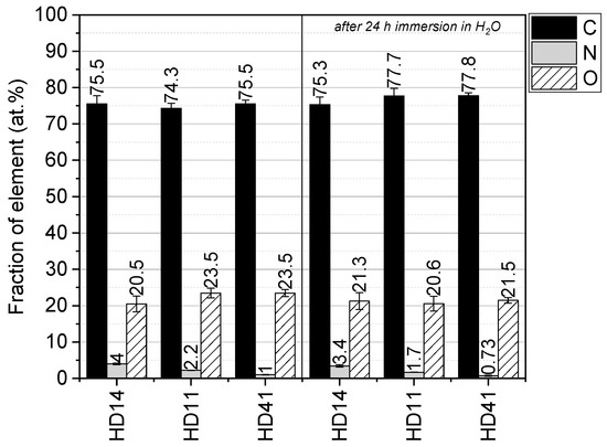 XPS elemental analysis of the different hydrogel mixtures (d-HD), as-deposited and after immersion in water for 24 h (n = 3).