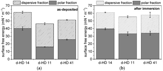 The surface free energy (SFE) is the work that is needed to increase the surface area of a solid phase. Since every system strives for a state of low free energy, solids form an interface with liquids in order to reduce this energy. Moreover, the SFE plays a key role in cell material interactions in terms of tissue engineering or biosensor development [38,39]. For the calculation of the SFE, the method of Owens, Wendt, Rabel, and Kaelble [40] was used, whereby the SFE is divided into a polar and a dispersive component Figure 5 shows the SFE for the different d-HD films as-deposited and after immersion in deionized water for 24 h. The bare gold electrode has an SFE of 30 mN/m−1, consisting of 3.6 ± 1.3 mN/m−1 polar fraction and a dispersive fraction of 27.2 ± 1.6 mN/m−1 (Figure S5). With deposited hydrogel coatings on the electrode surfaces, the SFE increases, ranging from 45 to 60 mN/m−1, due to a remarkable increase in the polar fractions of the hydrogel mixtures (Figure 5a). After storage in water (Figure 5b), a further increase in the SFE, especially for the polar fraction, was recorded for d-HD11 and d-HD41, whereby d-HD14 remains at the same level. This can be explained by the introduction of polar groups (-OH) to the pp hydrogel films during the immersion, resulting in an increased polar fraction [41]. The polar fraction for d-HD14 is comparably high before and after immersion. For all HD mixtures studied, the SFE ranges between 55 and 61 mN/m−1 after immersion, which is in agreement with the literature values for HEMA-based hydrogels [42]. In contrast, the SFE of n-HD films are comparably lower (~45 mN/m−1) and do not change significantly after immersion in water (Figure S6). Moreover, a lower polar fraction was determined for the n-HD coatings after immersion with 15 mN/m−1 in comparison to the d-HD coatings with 35 mN/m−1. Since both coating generation methods (droplet and nebulizer) have the same polymerization time of 30 s, the thinner n-HD coatings might polymerize more strongly in the same time, which leads to lower proportions of the functional polar groups. A similar phenomenon was observed by Klages et al., where a higher degree of functional groups from the polymerization of glucidyl methacrylate remains due to shorter plasma treatment times [43]. The results confirm high SFE and sorption properties due to a high value of polar forces on the plasma-polymerized hydrogels generated via the droplet method.