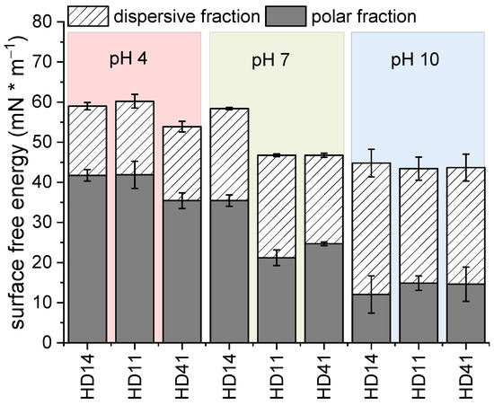 Surface free energy of the pp d-HD films stored in different pH solutions.