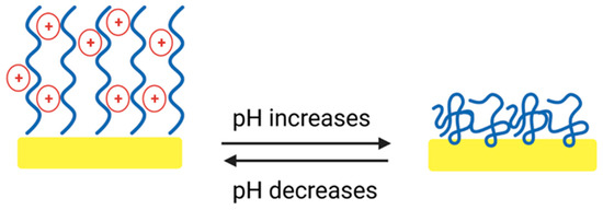 For the bare gold electrodes, the overall SFE increases after storage in pH 4 and 10 to 50 and 57 mN/m−1, respectively (Figure S5). Additionally, a high polar fraction was noticed, 33 mN/m−1 at pH 4 and 46 mN/m−1 at pH 10. This can be attributed to the presence of acid and alkaline molecules that remain on the gold surface after storage in the different pH buffer solutions. For all d-HD coatings investigated, it can be seen that the polar component decreases with increasing pH (Figure 6). At pH 4, the tertiary amine groups of DEAEMA are protonated, leading to an electrostatic repulsion of the positive charges, which results in a stretched, flexible conformation of the HD14 coating (Figure 7) [45,46,47].