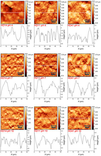 AFM was applied to study the topography of the plasma-polymerized d-HD films. Deposition on smooth glass substrates (Figure S8) revealed network-like structures for HD14, while with increasing HEMA content, a fold structure is pronounced. For HD41, it was observed that some areas of the folds seem to stick together. A transfer of the hydrogel films onto gold electrodes was examined in air (Figure S9) and immersed in solutions of different pHs (Figure 8A–I). For the HD films exposed to air only (Figure S9), it can be seen that surface instabilities during the plasma polymerization processes also induce the formation of folds, due to mechanical stress or monomer evaporation during the plasma process [50,51]. For d-HD14, the folds are not strongly pronounced, and at the same time, the surface shows smooth areas, and the folds of d-HD11 and d-HD41 appear more tightly packed [33,37]. Furthermore, the RMS surface roughness was determined (Table 3), which reveals that each hydrogel is highly rough, but in comparison to the bare gold electrode (RMS of 0.89 ± 0.02 µm, AFM see Figure S10), the coatings have a smoothening effect on the surface and irregularities are covered (as was shown in the microscopic pictures before). Nevertheless, the formed folds of the hydrogel coatings are irregular as well, as can be seen in the corresponding height profiles below each AFM image. HEMA is well known as the “backbone-forming” unit of acrylate-based hydrogels; therefore, the addition of more HEMA in the mixture (while keeping the process parameters constant) leads to a stronger fold formation, which correlates with the surface thickness [30,31,52]. For d-HD films immersed in buffer solutions of different pHs, morphological changes can be seen for d-HD14 as compared d-HD11 and d-HD41. In pH 4 and pH 7, the surface features of d-HD14 with small fold structures disappear, and the height of the surface features increases enormously, indicating a swollen state (Figure 7). Since the tertiary amine groups of DEAEMA are protonated in aqueous media, a stretched conformation (as mentioned in the SFE section) of the d-HD14 coating occurs [34,35,45], due to the absorption of more water molecules (as previously shown in the wettability and SFE experiments). In particular, in the buffer solution of pH 4, the RMS increased by a factor of 1.7, demonstrating significant differences in the heights of the topographical features. The AFM image of d-HD14 stored at pH 10 shows smaller folded structures than at pH 4 and pH 7. Furthermore, the RMS of 0.83 ± 0.04 µm is higher than in pH 7 and lower than in pH 4, which indicates a shrunken state due to the deprotonation of the tertiary amine groups. For d-HD11 and d-HD41 films, the amount of DEAEMA is lower, resulting in a limited ionization level and less intense swelling behavior at an acidic pH. While the RMS roughness of d-HD11 and d-HD41 stored at pH 4 and pH 7 are similar, the value increases after immersion in pH 10, demonstrating again the shrunken surfaces with structural changes resulting in strongly pronounced folds. The results of the AFM measurements clearly show that the H:D mixture ratio has a direct influence on the morphology of the surface texture. To test the influence of the pH value on the surface morphology, AFM was performed at acidic as well as at alkaline conditions, revealing a remarkable response attributed to the DEAEMA amount. Similar observations of spin-coated HEMA and poly(ethylene glycol) diacrylate (PEGDA) hydrogels were made by González-Henríquez et al. [37]