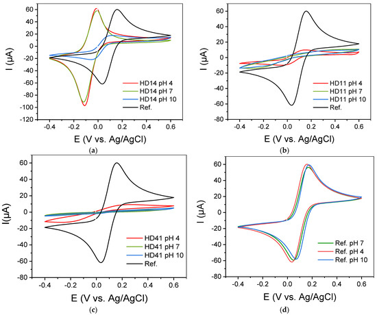 dependent fixed charges in the coating, as described by Anson [55,56] and Doblhofer [57,58]. For pH 7, the same phenomenon was observed, but with less intensity (as also discussed in the section on surface free energy and pH-responsive behavior). However, for pH 10, the peak current decreases due to the deprotonation of the DEAEMA, resulting in a more hydrophobic property (as can be seen from the free surface energy results above). The electrostatic repulsion between the positive charges on the polymer chains is weakened or has disappeared completely, and the attraction between the polymer chains increases in such a way that the polymer chain coils and, thus, collapses [23]. The collapsed and compact structure of pp d-HD films at pH 10 leads to a lack of flexibility of the coating, which results in the suppression of the electroactive species transmission through the hydrogel to the electrode surface [34]. The same trend was observed for d-HD 11, as can be seen in Figure 9b, but with a strikingly low response. While the current peaks can still be seen at pH 4, they are almost flattened at pH 7 and completely lost at pH 10. This behavior can be explained by the lower DEAEMA content and, therefore, a lower protonation level, leading to a less expanded conformation at lower pHs. The influence of a very low DEAEMA content (HD41) becomes even more obvious in Figure 9c, where no oxidation and reduction peaks can be seen at different pH values. This confirms that by increasing the DEAEMA content, the electrostatic adsorption of the negatively charged redox probe on the hydrogel is enhanced, which produces a higher current in the related CV. In Figure S11, the CVs for the n-HD hydrogels are shown. The trend in different pH solutions for the films is the same as for the d-HD hydrogels, but with strikingly less response. This might be attributed to a higher degree of polymerization (as discussed in the SFE section) of the thinner coatings, resulting in a lesser electron transmission and entrapment capacity.
