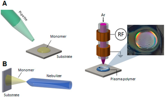 The deposition of the hydrogel coatings comprises three consecutive steps: (i) pre-treatment of the gold surface by using Ar plasma for 30 s; (ii) applying the liquid phase monomer mixture (HEMA-co-DEAEMA, HD, with different mixture ratios 1:4, 1:1, and 4:1 v/v) on the gold substrate, and (iii) subsequent plasma polymerization by applying Ar plasma for 30 s. Plasma-polymerized hydrogel coatings of different thicknesses were generated by using two setups schematically shown in Figure 10. The droplet method was used for the deposition of coatings with thicknesses >0.5 µm by pipetting 0.1 µL of the HD mixture onto the plasma-activated gold substrate, whereas the nebulizer method (1 standard liter per minute (slm) Ar flow rate and 1 s nebulization time) was applied for depositing a thin liquid layer of the HD mixture, resulting in coatings with thicknesses <0.5 µm. The plasma-induced surface activation and polymerization of the HD mixtures were carried out by using a 27.12 MHz-driven atmospheric-pressure plasma jet (described in detail by Schaefer et al. [59]), schematically shown in Figure 1, operated at a plasma input power of 5 W, with 1 slm Ar as working gas at a nozzle outlet-to-substrate distance of 5 mm.