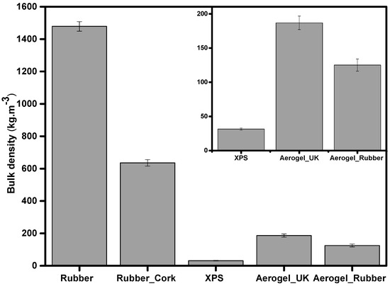 Measured bulk density of the different materials: recycled rubber, rubber_cork composite, XPS, aerogel_UK, and new aerogel_rubber composite.