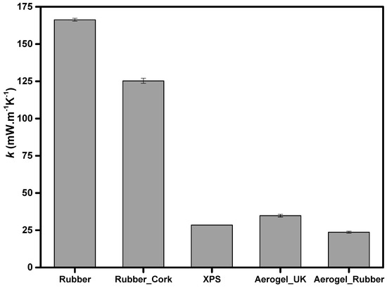 Measured thermal conductivity (), using the Hot Disk® TPS method, of the different materials at 22 °C: recycled rubber, rubber_cork composite, XPS, aerogel_UK, and new aerogel_rubber composite.