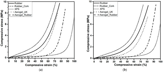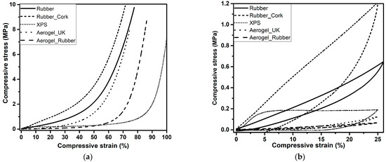 Uniaxial compression test up to densification with a load cell of 3 kN of the rubber, rubber_cork composite, XPS, aerogel_UK, and new aerogel_rubber composite: (a) without ageing and (b) 6 weeks ageing.