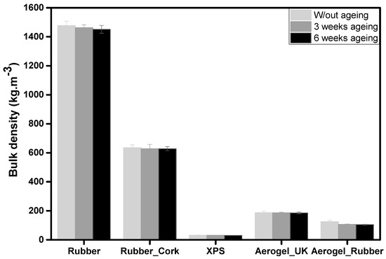 For the small cylindrical samples (diameter of 40 mm and height of 10 mm) of the new aerogel_rubber composite, differences in ageing can already be seen, as shown in Figure 6. The bulk density was 125.2 ± 8.9 kg·m−3 without ageing and 106.4 ± 2.6 kg·m−3 and 104.2 ± 3.1 kg·m−3 for 3 weeks ageing and 6 weeks ageing, respectively. This decrease in the bulk density may be related to the release of some residual solvents from the synthesis during the heat stages of the ageing. For the other materials (rubber, rubber_cork composite, XPS, and aerogel_UK), the bulk density values did not change significantly and the values were within the measurement error.