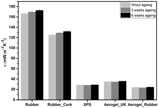 For samples with higher thermal conductivities, ageing has a greater effect on the increase in this property when compared to the more insulating samples, i.e., for recycled rubber, the thermal conductivity increased from 166.3 ± 2.4 mW·m−1K−1 (without ageing) to 172.5 ± 2.4 mW·m−1K−1 (6 weeks ageing); for the rubber_cork composite the increase was from 125.3 ± 2.3 mW·m−1K−1 (without ageing) to 131.9 ± 1.6 mW·m−1K−1 (6 weeks ageing); in the case of XPS the value changes from 28.5 ± 0.0 mW·m−1K−1 (without ageing) to 28.9 ± 0.1 mW·m−1K−1 (6 weeks ageing); for the aerogel_UK the increase was from 34.8 ± 0.1 mW·m−1K−1 (without ageing) to 35.9 ± 0.5 mW·m−1K−1 (6 weeks ageing); and for the new aerogel_rubber composite the increase in thermal conductivity was from 23.8 ± 0.2 mW·m−1K−1 (without ageing) to 24.3 ± 0.7 mW·m−1K−1 (6 weeks ageing), as shown Figure 7. The greatest difference for thermal conductivity occurred for recycled rubber. In general, the conductivity increased with the number of ageing cycles (humidity and temperature). The here tested materials are mostly hydrophobic; however, with ageing it can be expected that some water vapour remains in the macropores, and this leads to an increase in the thermal conductivity of the materials.