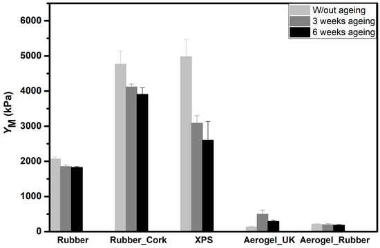 As illustrated in Figure 8, the Young’s modulus (YM) decreases as the ageing time increases, leading to a gradual decrease in the stiffness of the materials. This happened for all materials, except for the aerogel_UK samples, probably due to the protective plastic layer, which affects the results for this type of sample. For the other materials, it is anticipated that each chain/layer will have water molecules in its vicinity, which reduces the matrix interconnectivity and increases the chains/layers mobility [57]. This is less pronounced in the aerogel_rubber composite due to its very high hydrophobicity.