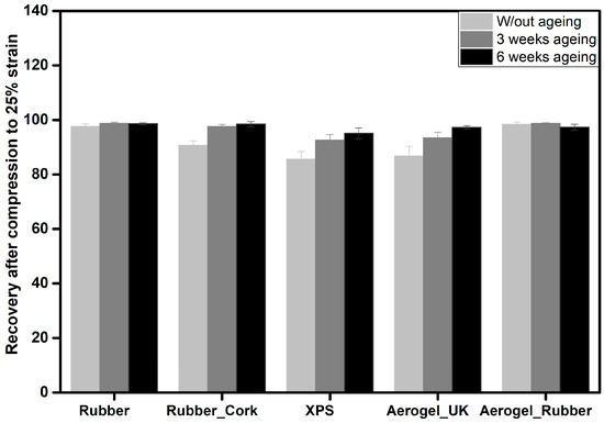 The number of ageing cycles led to a progressive increase in the recovery. This is in agreement with the decrease in the Young’s modulus in the same conditions, as the samples become progressively more flexible. Therefore, it can be considered that these different insulation materials can be used in regions with more severe climates without major limitations on their performance.