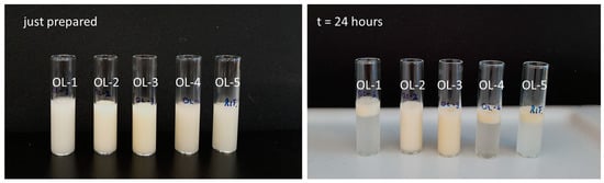 The emulsion represents the starting material for the encapsulation treatment. Therefore, it is mandatory to verify if it has all the characteristics to be submitted to the process. First of all, the emulsion has to be stable for a time period sufficient to conclude the microencapsulation process. Immediately after the preparation, all the emulsions were stable. They appeared milky and opaque even if those in which the polymer concentration was higher (OL-2 and OL-3) presented a yellow color. OL-4 emulsion started to separate just 1 h after the preparation, while the stability of the other samples was maintained over time. After 24 h, only OL-2 and OL-3 formulations could be considered stable because they did not show any phase separation (Figure 1).
