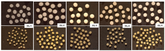 Immediately after the preparation, wet microparticles were quite large in dimension (about 3.0 mm in diameter), white and glossy with a smooth and homogeneous surface (Figure 2). OL-2, OL-3 and OL-5 systems were also regular in shape, while OL-1 and OL-4 batches included many irregular and elongated particles. After drying, in general, the diameters of the microparticles decreased because of the water evaporation and the packing of the polymer chains, and in some cases, the shape irregularity became evident, as confirmed by the stereomicroscope images and by the shape factor values which are very far from that assumed by a spherical particle (Table 3).