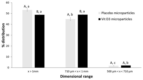 Particle size distribution of dried microparticles. Dissimilar capital letters over bars denote significant differences between samples within the same dimensional range (p < 0.05); while different lowercase alphabetical characters denote significant differences among different dimensional ranges within the same sample (p < 0.05).