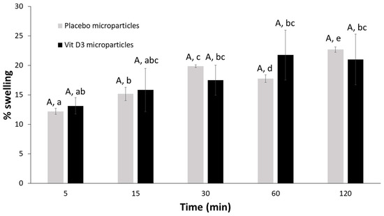 Swelling percentages of dried microparticles in water. Different capital letters over bars show significant differences between samples at the same time intervals (p < 0.05); while dissimilar lowercase letters indicate significant differences among different time intervals within the same sample (p < 0.05).