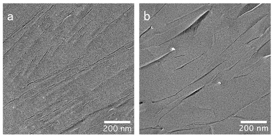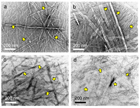 We previously reported the relationship between Tgel and the length of the methylene chain between the amide and amine oxide groups (n) in aqueous AAO solutions [30,31]. Briefly, Tgel increased with n for all methylene chain lengths (k = 9, 11, and 13 in the hydrophobic part), and cryo-TEM observations showed the formation of thin and linear rod-like aggregates in the region where Tgel linearly increased with n [30,31]. The slope of the plot of Tgel against n (dTgel/dn) was 30, 20, and 15 for k = 9, 11, and 13, respectively, indicating that the effect of n on Tgel diminishes with increasing k, i.e., with the lengthening of the hydrophobic chain. This was attributed to the decrease in the curvature of the aggregates with increasing k. At the same time, the Tgel vs. n curves of both 11-2-2-6 and 13-2-2-6 significantly deviated to the upside from the straight line; notably, a flat ribbon-like structure was observed in these two samples by cryo-TEM [30]. The present cryo-SEM observations (Figure 3) also show an aggregate structure, which is in good agreement with that observed using cryo-TEM. Quick-freeze replica TEM images also reveal thin linear aggregates in 9-2-2-6 (Figure 4a) and wide twisted structures in 11-2-2-6 (Figure 4b). Negative-staining TEM also shows rod-like aggregates in 9-2-2-6 (Figure 5a) and 13-2-2-4 (Figure 5c), and ribbon-like structures in 11-2-2-6 (Figure 5b) and 13-2-2-6 (Figure 5d). In summary, the shapes of the aggregates observed using cryo-TEM, cryo-SEM, quick-freeze replica TEM, and negative-staining TEM are in good agreement with each other. Generally, in negative-staining methods, there are concerns about structural changes in the aggregates caused by staining agents and the drying out of water. However, in this study, the aggregate structures obtained using negative-staining methods are in good agreement with those observed by non-staining cryo-methods, indicating no effect of the staining agent and drying. These results suggest that the relationship between Tgel and n accurately reflects the structure of the aggregates formed in water.