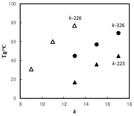 The k-dependence of the Tgel of k-2-2-3 (solid triangles), k-2-2-6 (open triangles) [31], and k-3-2-6 (solid circles).
