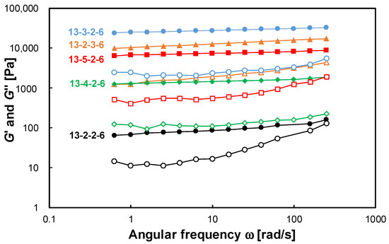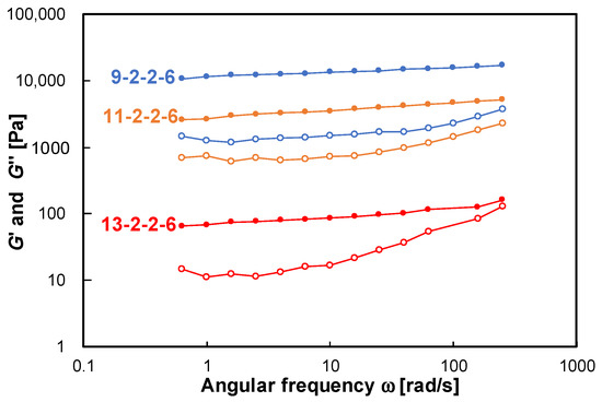 Next, the relationships of G′ and G″ with an angular frequency of k-2-2-6 (k = 9, 11, and 13) were investigated, and the results are shown in Figure 8. In all the examined regions, G′ is larger than G″ in the gelled state. Both G′ and G″ are larger when k is small. As mentioned above, an aqueous solution of 9-2-2-6 was confirmed to have rod-like aggregates, whereas the aqueous solutions of 11-2-2-6 and 13-2-2-6 have ribbon-like aggregates. Ribbon-like aggregates have a more regular arrangement of molecules, such as in solid or crystalline structures, whereas rod-like aggregates have a larger curvature and greater intermolecular distances than ribbon-like aggregates. Hydrogels with ribbon-like aggregates are less viscous and less elastic than gels with rod-like aggregates. In the present study, similar results were obtained for samples with different n, indicating that differences in the aggregate structure affect the viscoelasticity of the hydrogels.