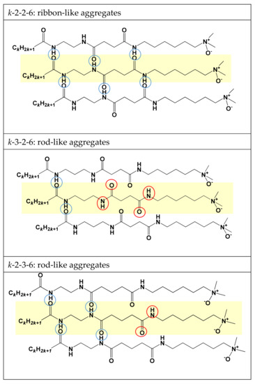The effect of the length of the methylene chain in the hydrophobic part (k) on Tgel, aggregate structures, and viscoelasticity are discussed. The value of k affects the hydrophobic interaction between AAO molecules in water. The relationship between Tgel and k is shown in Figure 7: Tgel increases with k in all cases [31]. The slopes (dTgel/dk) for k-2-2-3 and k-3-2-6, which formed rod-like aggregates, are 7.0 and 6.0, respectively. At the same time, for k-2-2-6 (11 ≤ k ≤ 13), which formed ribbon-like aggregates, the slope is 17, which is considerably higher than that for the rod-like aggregates. Ribbon-like aggregates have a lower curvature and thus a shorter distance between neighboring molecules than rod-like aggregates, suggesting a greater contribution of intermolecular hydrogen bonds to the stabilization of the former aggregates. At k = 13, the Tgel values for 13-2-2-6, 13-3-2-6, and 13-2-2-3 are 77, 45, and 17 °C, respectively. Although 13-3-2-6 and 13-2-2-3 both form similar rod-like aggregates, their Tgel values differ by 28 °C. In other words, even aggregates with similar rod-like structures have significantly different temperature stabilities owing to differences in the lengths of methylene chains other than the hydrophobic chain.