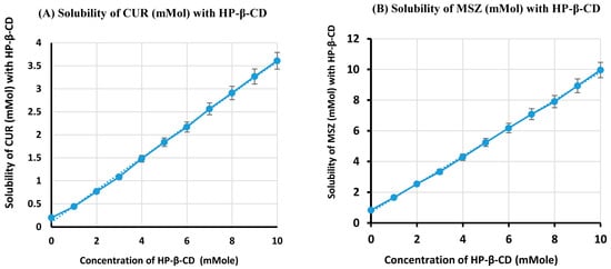 Phase-solubility diagram for the complex ingredients. (A) CUR with HP-β-CD, (B) MSZ with HP-β-CD systems using water at 37 °C.