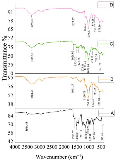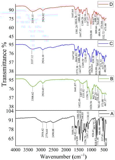 FT-IR spectra of each component of the inclusion complexes. (A) Free MSZ, (B) HP-β-CD, (C) HP-β-CD-MSZ physical mixture, and (D) MSZ/HP-β-CD inclusion complex.