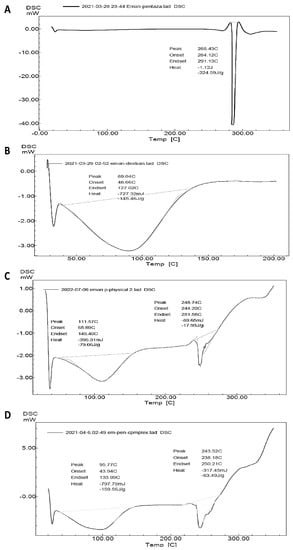 For further confirmation of inclusion complex formation, DSC thermograms of MSZ, HP-β-CD, the MSZ and HP-β-CD physical mixture, and the HP-β-CD/MSZ inclusion complex were acquired (Figure 3A–D). Changes in the endothermic peak locations and intensities in either the physical mixture or the inclusion complex from those of the individual ingredients indicate a possible interaction between the studied ingredients. The DSC thermogram of MSZ presented a single endothermic peak at 286.43 °C (Figure 2A), corresponding to its melting point. On the other hand, the HP-β-CD thermogram demonstrated a single broad peak at 89.04 °C (Figure 2B). The thermogram of the MSZ and HP-β-CD physical mixture (Figure 2C) showed that the MSZ endothermic peak had shifted from 286.43 °C in pure MSZ to 257.23 °C in the physical mixture thermogram, indicating a possible interaction between the two ingredients. The thermogram of the HP-β-CD/MSZ inclusion complex showed a further shift in the MSZ endothermic peak location to 243.52 °C (Figure 2D). This observed shift supported the previous phase solubility and FTIR spectroscopy findings to indicate the formation of an HP-β-CD/MSZ inclusion complex.
