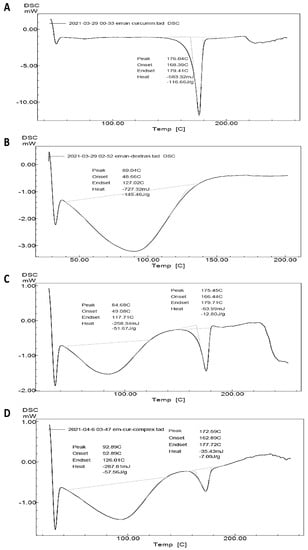 DSC thermograms of components of the inclusion complexes. (A) Free curcumin, (B) HP-β-CD, (C) curcumin and HP-β-CD physical mixture, and (D) CUR-HP-β-CD inclusion complex.